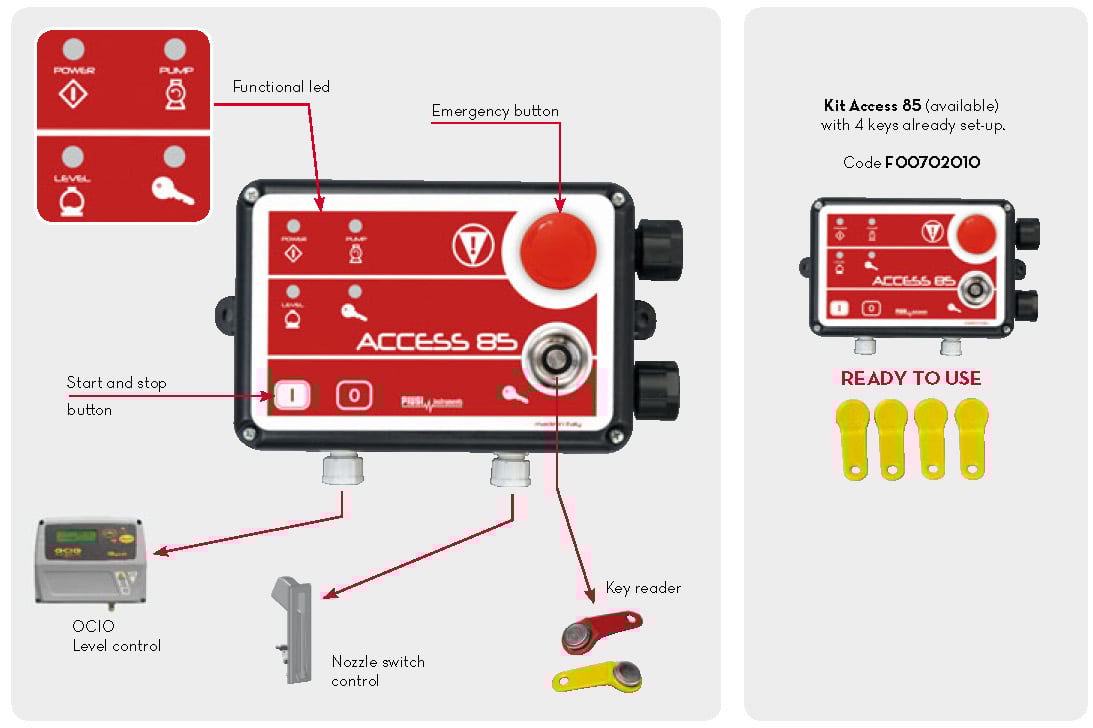 The access 85 can also be used with the Ocio level monitor so that when the fuel storage tank reaches its low level limit no more fuel can be dispensed via the Access 85 to prevent damage to the pump. The unit also features an emergency stop button.